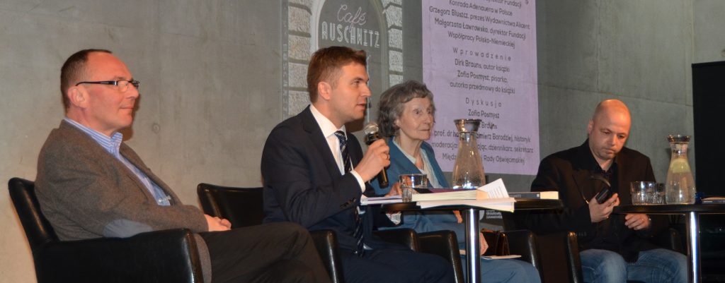 Ablauf des Treffens im Café Skwer: Begrüßung von Seiten der Organisatoren: Gregor Bluszcz, Vorsitzender des Akcent-Verlages, Dr. Christian Schmitz, Direktor der Konrad-Adenauer-Stiftung in Polen sowie Verteter der Stiftung für deutsch-polnische Zusammenarbeit. Dirk Brauns, der Autor des Buches wird die Diskussion gemeinsam mit der Schriftstellerin und Verfasserin des Vorworts Zofia Posmysz mit einigen Sätzen einleiten. Diese nimmt außerdem zusammen mit Prof. Włodzimierz Borodziej an dem Gespräch teil. Moderiert wird die Diskussion von Marek Zając, Journalist und Sekretär des Internationalen Auschwitzrates.