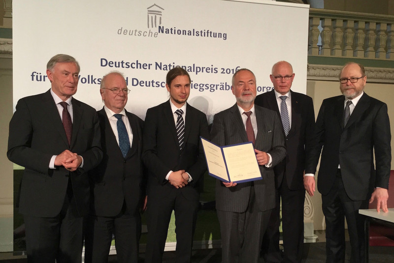 Die Deutsche Nationalstiftung hat den Volksbund Deutsche Kriegsgräberfürsorge e. V. am 15. Juni für seine Gedenk-, Bildungs- und Jugendarbeit mit dem Deutschen Nationalpreis 2016 ausgezeichnet. Zur offiziellen Verleihung des mit 50 000 Euro dotierten Preises waren rund 400 Vertreter des öffentlichen Lebens in die Französische Friedrichstadtkirche in Berlin gekommen.