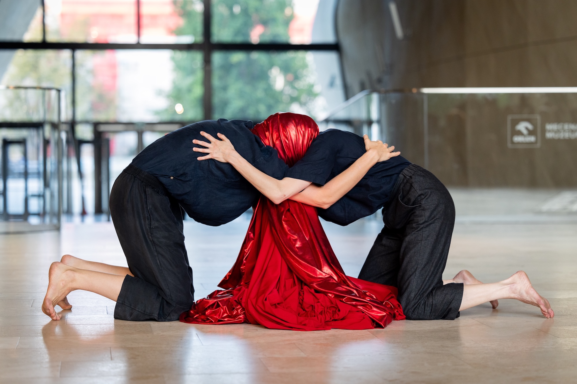 Zwei Tänzerinnen und ein Kontrabassist verleihen verlorenen, verdrängten oder fragmentierten Erinnerungen eine physische Form. Vergrabene und vergessene Geschichten kommen langsam wieder zum Vorschein. Ein Stoff wird dabei zum verbindenden Element, als Haut, Grenze, Schutz und Resonanzraum zugleich. Er erinnert an das, was uns trennt, und an das, was uns trägt. So entsteht eine intime Brücke: ein Tanz über Erinnerung, über Verbindung und Verwandlung, über Identität.